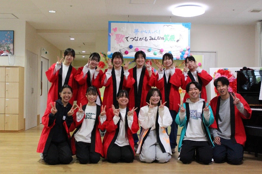 10/19(日)に、昨年度より実施している施設利用者様の夢をかなえるプロジェクト『夢かなえっべ!~いっしょに・もっと・にっこり笑顔~inてんどう』が本番を向かえました。今年度は“歌でつながるみんなの笑顔(わ)”をテーマに、会場となった「羽陽の里」は、参加された利用者様の歌声や笑顔で、温かい雰囲気に包まれました。本学と天童高校のボランティア学生・生徒たちは、5月からのプロジェクトの企画・準備を経て、当日も会場の装飾や花笠踊りの披露など懸命に取り組んでいました。関わった多くの方々のつながりを感じ、それが利用者様の夢や笑顔に結びつく、という今回の経験を、それぞれの学生・生徒が今後に活かせればと思います。今回のプロジェクトに参加・協力いただきました、天童高校様、羽陽の里様、天童市社会福祉協議会様に心から感謝申し上げます。